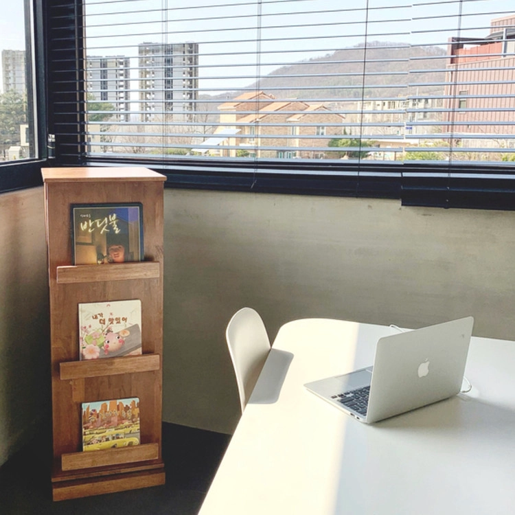 전면 책장 쪽에 예쁜 그림책, 매거진을 꽂아